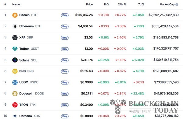15일 오전 10시 현재 글로벌 코인 시황 중계사이트인 코인마켓캡에서 비트코인은 24시간 전보다 0.21% 하락한 11만5067달러를 기록하고 있다.