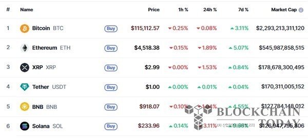 16일 오전 9시 25분 현재 글로벌 코인 시황 중계사이트인 코인마켓캡에서 비트코인은 24시간 전보다 0.25% 하락한 11만5112달러를 기록하고 있다.