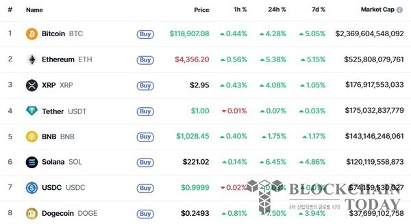 2일 오전 9시 30분 현재 글로벌 코인 시황 중계사이트인 코인마켓캡에서 비트코인은 4.28% 상승한 11만8907달러를 기록하고 있다.