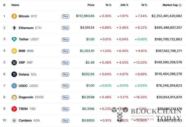 15일 오전 9시 45분 현재 글로벌 코인 시황 중계사이트인 코인마켓캡에서 비트코인은 24시간 전보다 1.97% 하락한 11만2993달러에 거래되고 있다.