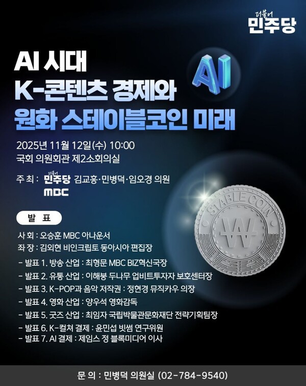 [블록체인투데이 정주필 기자] 대한민국 국회가 ‘AI 시대, K-콘텐츠 경제와 원화 스테이블코인의 미래’를 주제로 2025년 11월 12일(수) 오전 10시, 국회의원회관 제2소회의실에서 정책 토론회를 개최한다. 이번 행사는 더불어민주당 김교흥·민병덕·임오경 의원이 공동 주최하고, MBC가 함께 주관한다.