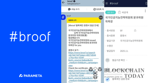 [블록체인투데이 박요한 기자] 웹3 인에이블러(Web3 Enabler) ㈜파라메타(PARAMETA, 구 아이콘루프, 대표 김종협)는 국가AI전략위원회가 최근 분과위원 및 자문위원 180여 명에게 발급한 블록체인 기반 위촉장을 자사 블록체인 증명서 발급 서비스 ‘브루프(broof)’를 통해 발급했다고 밝혔다.
