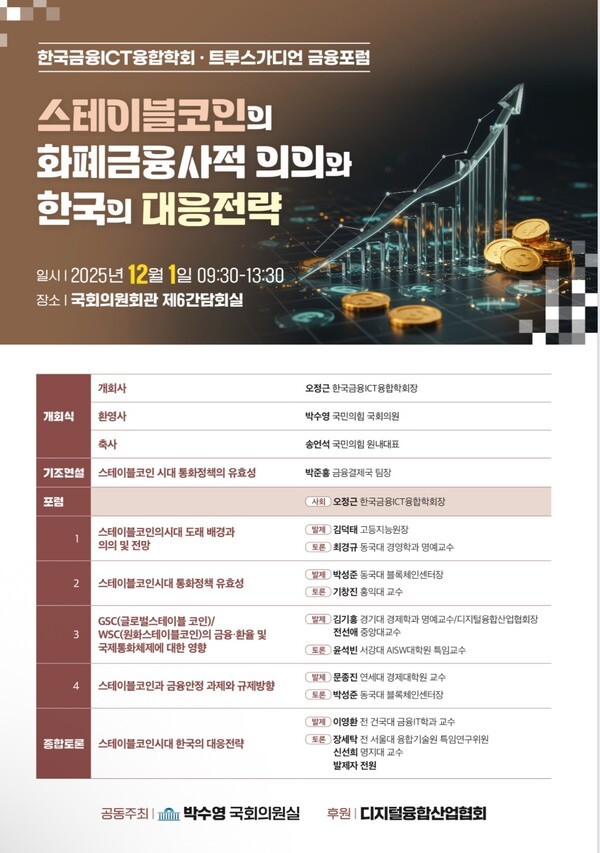 오는 2025년 12월 1일, 국회에서 스테이블코인의 통화금융학적 의미와 한국의 대응 전략을 논의하는 고위급 금융포럼이 열린다. 한국금융ICT융합학회가 주최하고 박수영 국회의원이 공동 주관하는 이번 포럼은 디지털 자산 시대의 정책 방향을 다루는 공식 논의의 장으로 평가받는다.